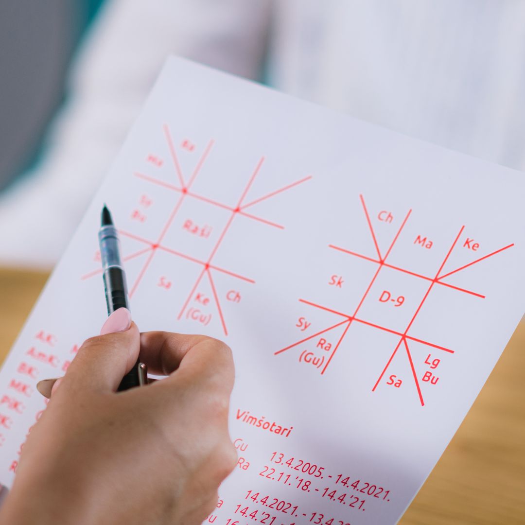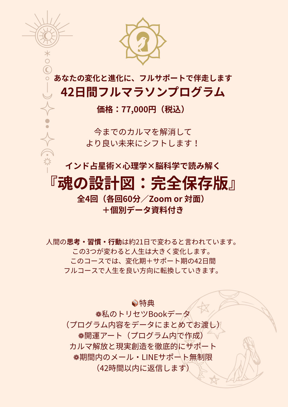 あなたがどんな性質や才能を持ち、どんな人生を歩むのか、そしてどんなカルマ(過去の行いの影響)を背負っているのかを、星の配置から読み取ります。自分自身の本質を知りたい方にとてもおすすめです。